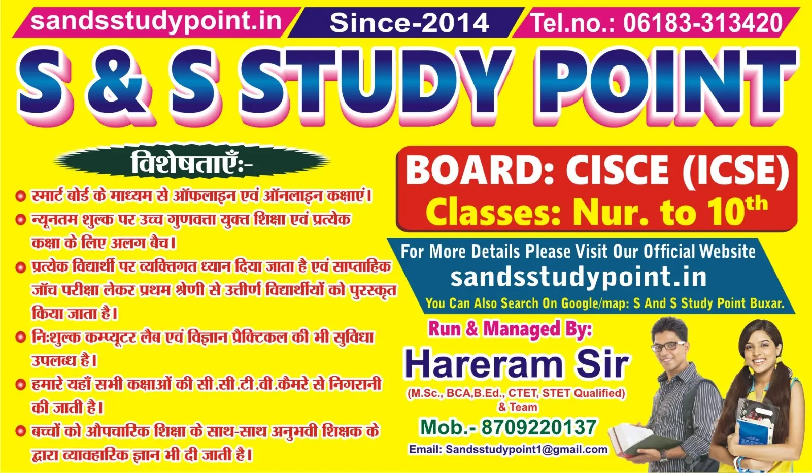S & S Study Point is an educational institute located in Buxar Bihar that provides academic coaching for students from nursery through tenth grade. The institute follows the CICSE board curriculum.